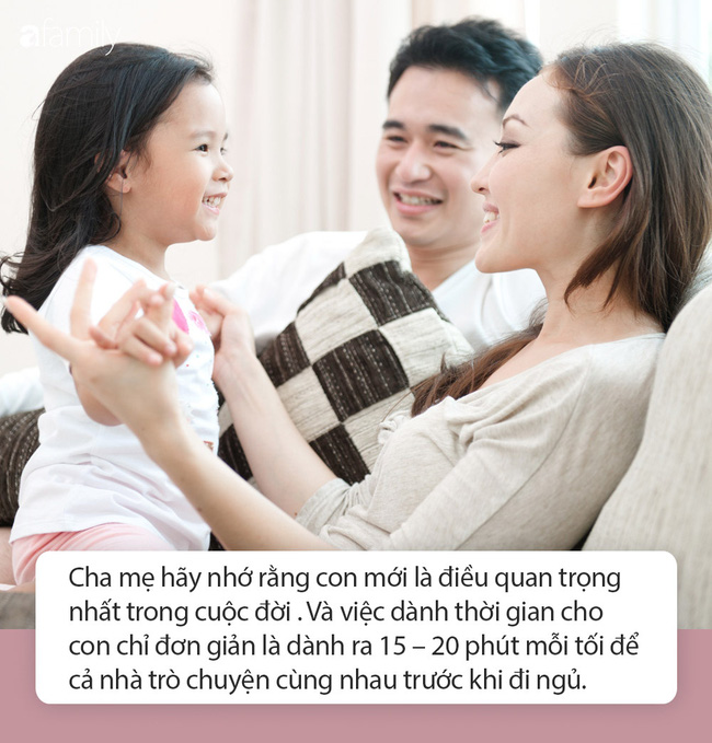 Nhiều cha mẹ vì bận rộn, quay cuồng với công việc cả nhà nên đến khi về nhà thường quên mất việc phải dành thời gian chơi đùa, lắng nghe và chia sẻ tâm tư với conDù bận thế nào, bố cha cũng mẹ nên nhớ rằng con mới là điều quan trọng nhất. Mỗi tối, bố mẹ hãy dành ra 15 – 20 phút để cả nhà cùng trò chuyện trước khi đi ngủ. Hoặc cuối tuần, cả nhà cùng nhau xem 1 bộ phim, đi dạo ở công viên, đi dã ngoại… để bồi dưỡng tình cảm gia đình.