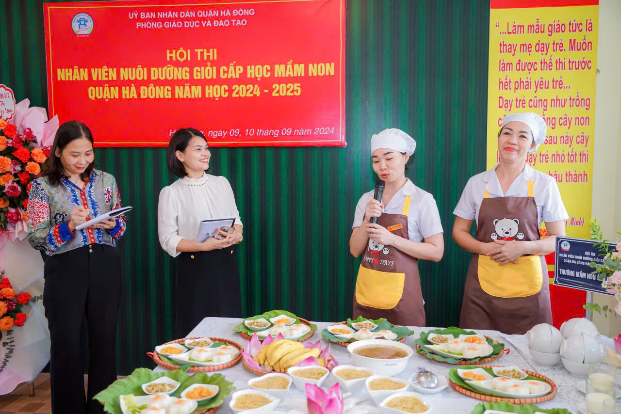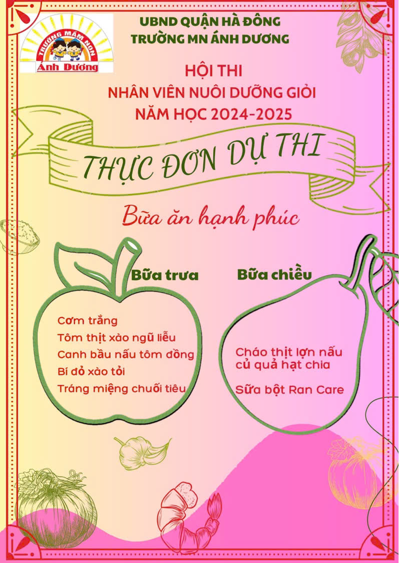 Xin chúc mừng 2 đ/c nhân viên nuôi dưỡng Trường Mầm non Ánh Dương đã phát huy năng lực, thể hiện tốt chuyên môn và chứng minh được sự sáng tạo trong xây dựng thực đơn, chế biến món ăn cho trẻ, nâng cao chất lưỡng chăm sóc nuôi dưỡng của nhà trường