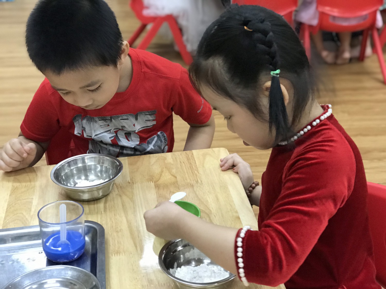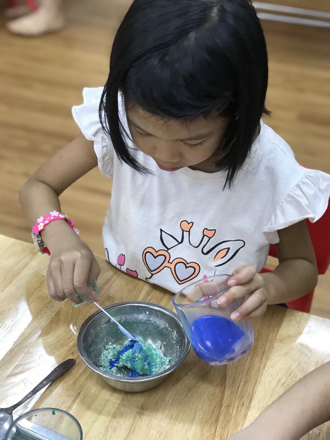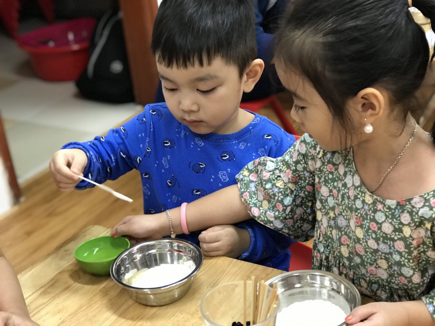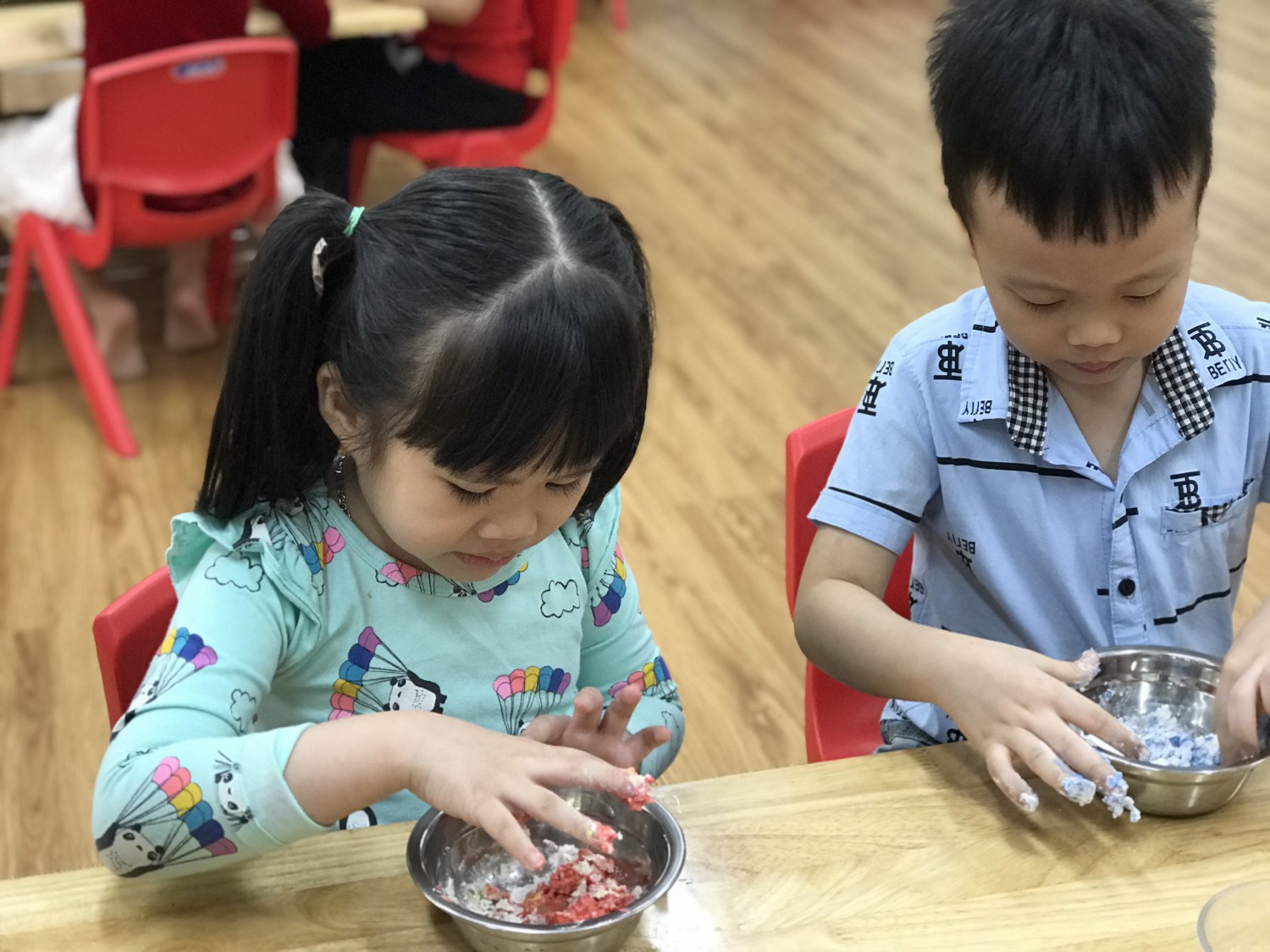 Với phương châm “Lấy trẻ làm trung tâm”, các cô giáo thiết kế những hoạt động nhằm khơi gợi niềm yêu thích, sự tò mò, ham hiểu biết của trẻ. Các bé được cùng nhau khám phá những sắc màu kỳ diệu trong cuộc sống qua hoạt động làm bột nặn, pha màu. Hơn thế nữa, các con được sử dụng bột nặn, màu nước do mình tạo ra để nặn, vẽ các sản phẩm tạo hình ngộ nghĩnh, đáng yêu