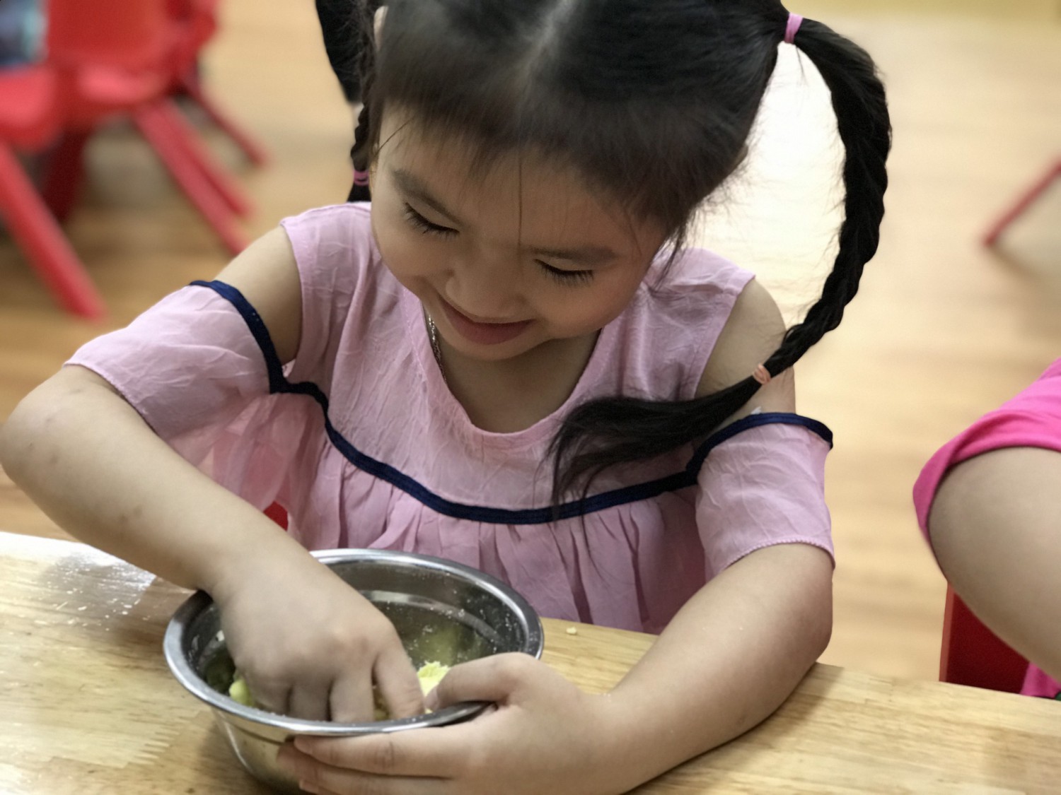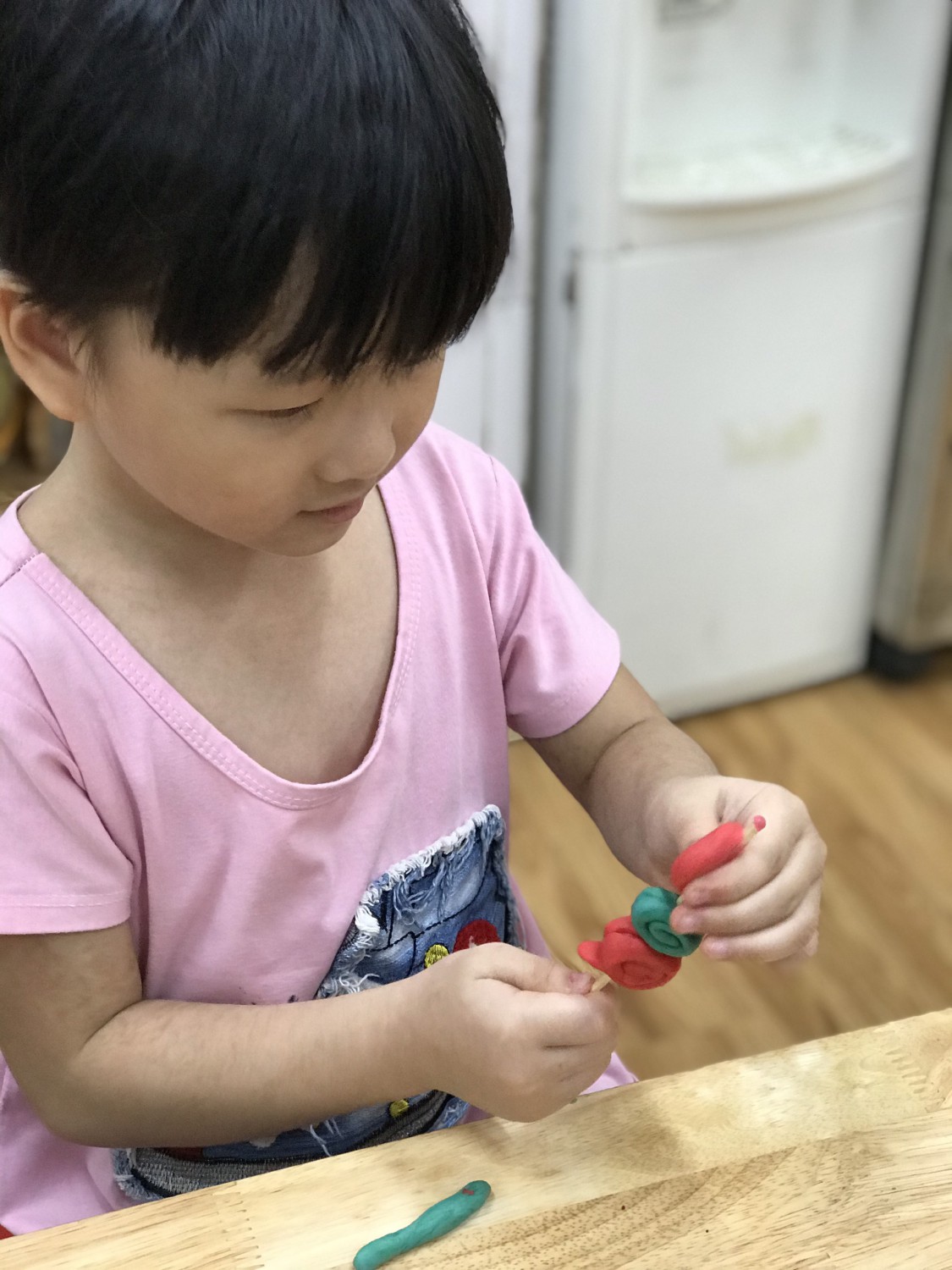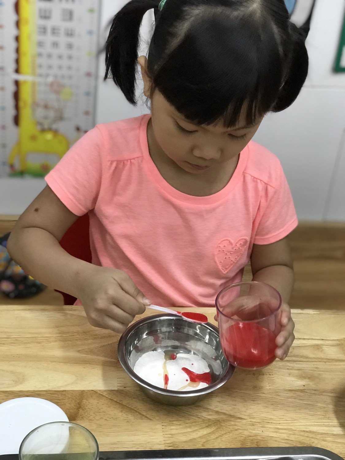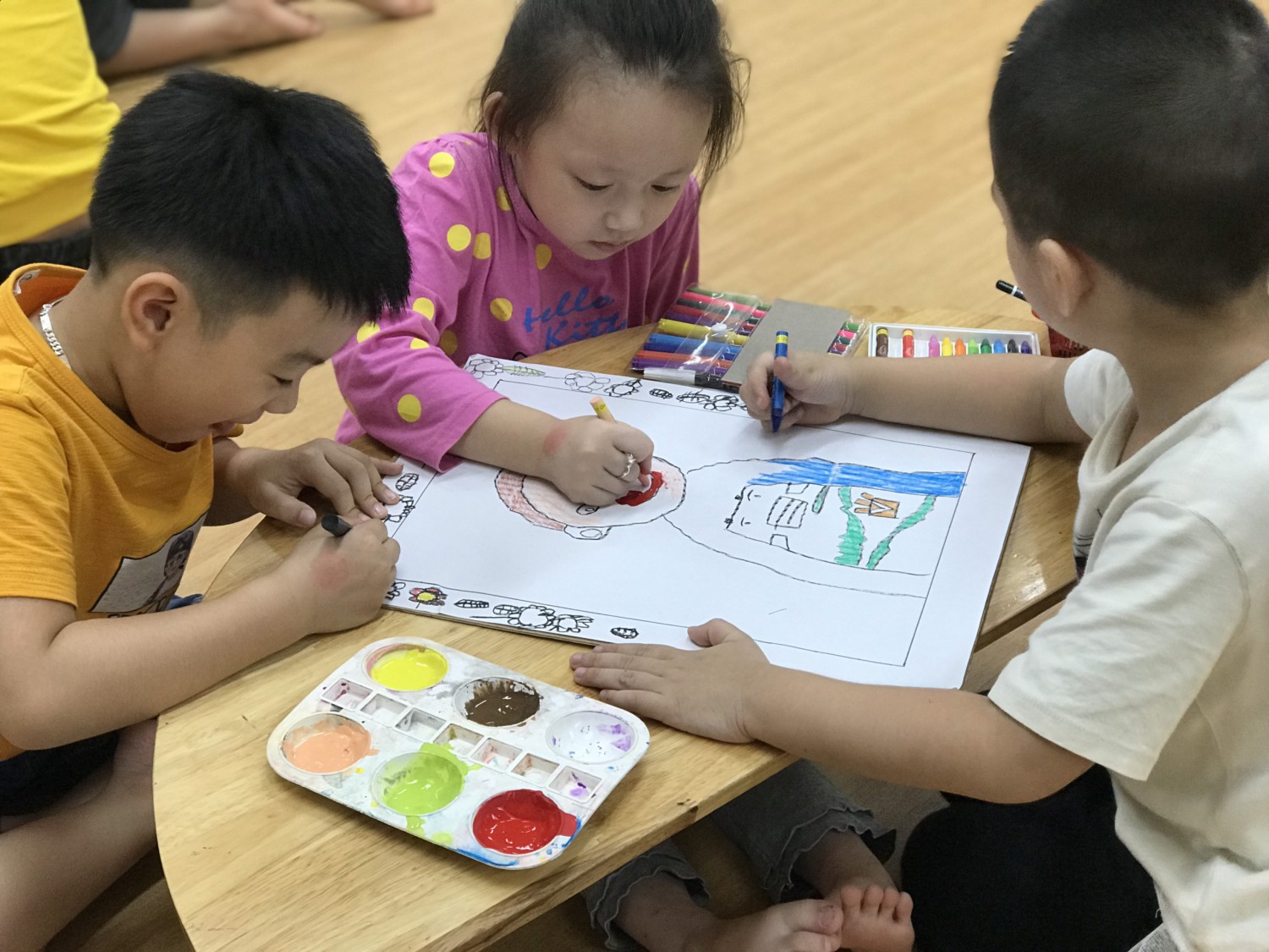 Với phương châm “Lấy trẻ làm trung tâm”, các cô giáo thiết kế những hoạt động nhằm khơi gợi niềm yêu thích, sự tò mò, ham hiểu biết của trẻ. Các bé được cùng nhau khám phá những sắc màu kỳ diệu trong cuộc sống qua hoạt động làm bột nặn, pha màu. Hơn thế nữa, các con được sử dụng bột nặn, màu nước do mình tạo ra để nặn, vẽ các sản phẩm tạo hình ngộ nghĩnh, đáng yêu