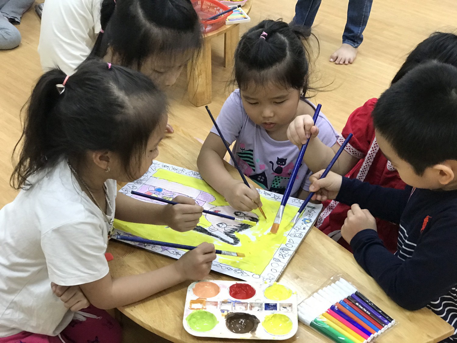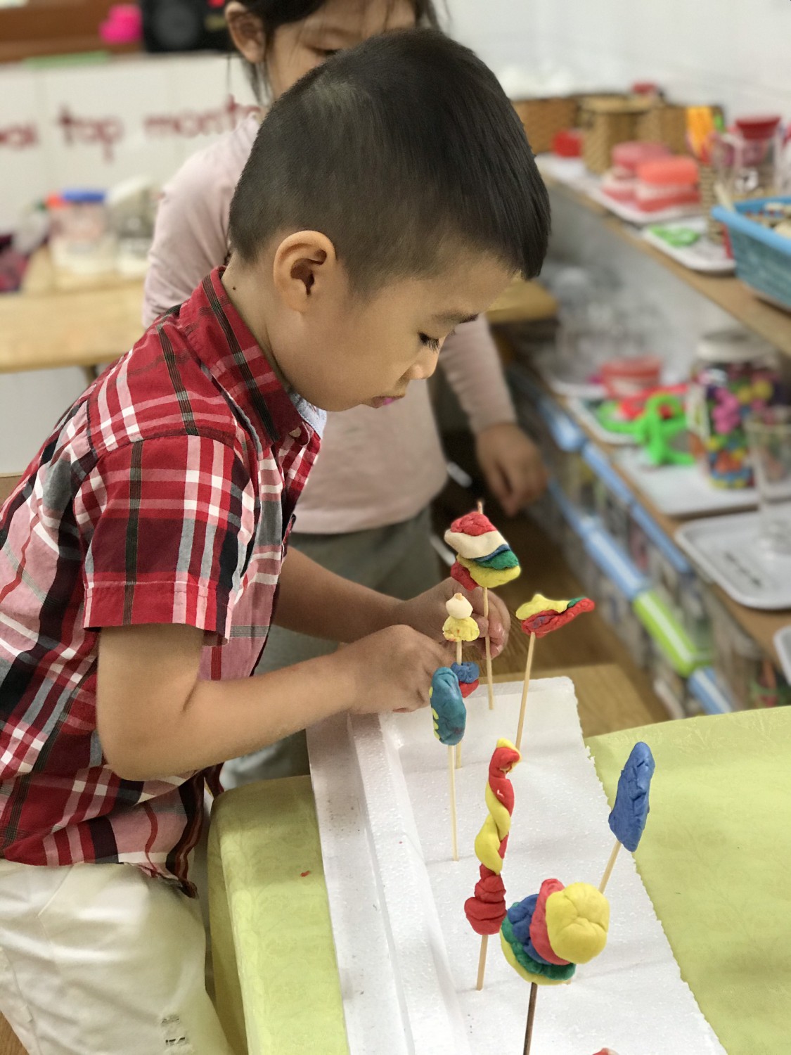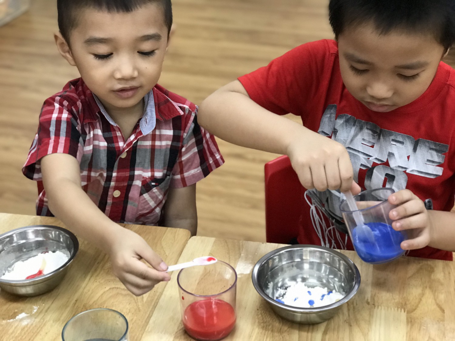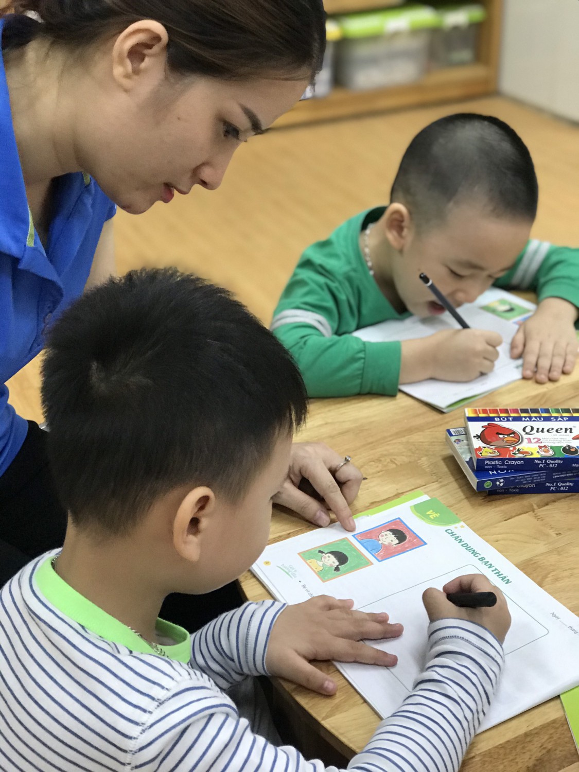 Với phương châm “Lấy trẻ làm trung tâm”, các cô giáo thiết kế những hoạt động nhằm khơi gợi niềm yêu thích, sự tò mò, ham hiểu biết của trẻ. Các bé được cùng nhau khám phá những sắc màu kỳ diệu trong cuộc sống qua hoạt động làm bột nặn, pha màu. Hơn thế nữa, các con được sử dụng bột nặn, màu nước do mình tạo ra để nặn, vẽ các sản phẩm tạo hình ngộ nghĩnh, đáng yêu